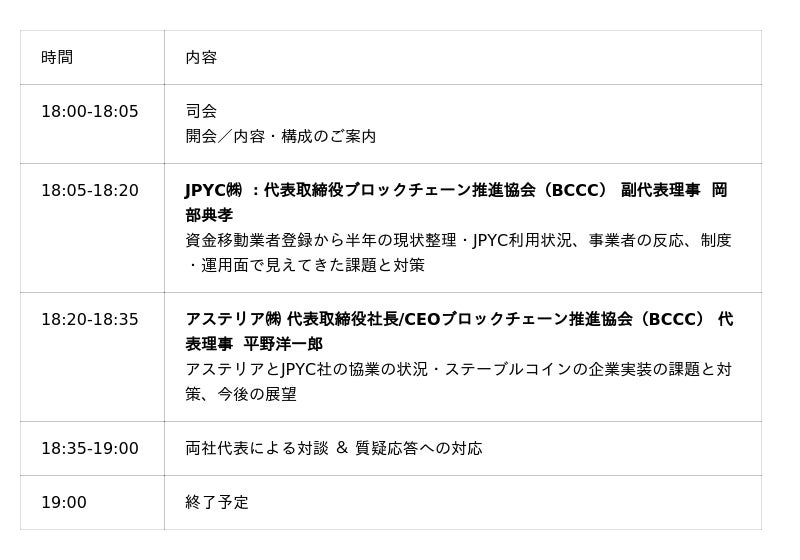 アステリア株式会社(本社:東京都渋谷区、代表取締役社長:平野洋一郎、証券コード:3853、以下 アステリア)は、JPYC株式会社(本社:東京都千代田区、代表取締役:岡部典孝、以下 JPYC社)が、資金決済法に基づく資金移動業者として登録された2025年8月18日から半年の節目を迎えるにあたり、ステーブルコインの現状と今後の展望をテーマとした「ステーブルコインフォーラム」を2月17日(火)18時から開催することを以下の通りご案内します。