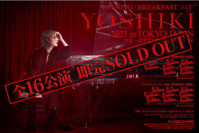 8月4日(金)より、9日間16公演にわたって開催されるYOSHIKIのディナーショー「EVENING / BREAKFAST with YOSHIKI 2023 in TOKYO JAPAN 世界一豪華なDINNER SHOW」の一般先着販売が4月17日(月)より開始されたが、昨年に引き続き今年もすべて即ソールドアウトした。