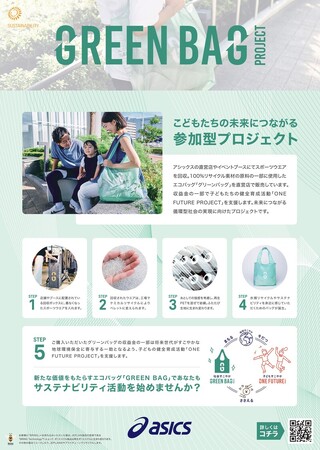 ※:GREEN BAG(https://www.asics.com/jp/ja-jp/mk/greenbag)は、アシックス直営店とアシックスウォーキングの全店で販売されており、その収益金の一部は、子どもの健全な育成を目的とした「ONE FUTURE PROJECT」の活動に活用されています。