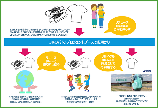 3Rとは【Reduce(リデュース)ごみを削減する】・【Reuse(リユース)再使用する】・【Recycle(リサイクル)資源化】を意味し、本企画では、リレフェスを観にいらした方やリレフェスに出場される皆さまに「まだ使えるけどサイズアウトしてしまったスポーツウェア」、「現役時代に使ったスパイク」、「履かなくなった運動靴」など、皆さまの思い出の品でまだまだ使える、使ってもらいたい衣料品(運動靴、スパイク等を含む。)や、ヨレ・ほつれ・洗っても落ちないシミなどがあって廃棄しようと思っていたスポーツウェアを3Rのバトンプロジェクトブースに持ち寄っていただき、次の未来につなげることで、衣類ロスと廃棄物の焼却に伴うCO2排出量の削減に貢献してまいります。