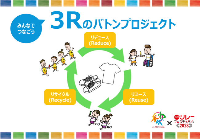 今年も10月7日(土)・8日(日)に国立競技場で開催する「みんなでつなごうリレーフェスティバル2023」(以下、リレフェス)の中で、「みんなでつなごう!3R(スリーアール)のバトンプロジェクト」を実施いたします。