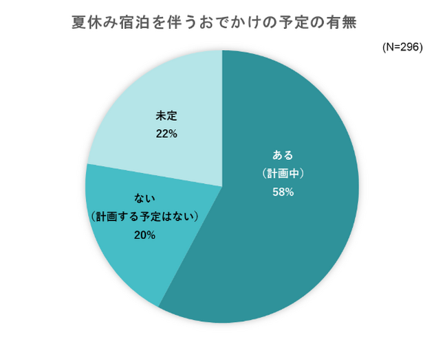 宿泊を伴うおでかけ予定が「ある(計画中)」という人が全体の58%と半数を超え、「ない(計画する予定はない)」という人が20 %、「未定」という人が22%という結果でした。多くの人が宿泊を伴うおでかけも予定しています。