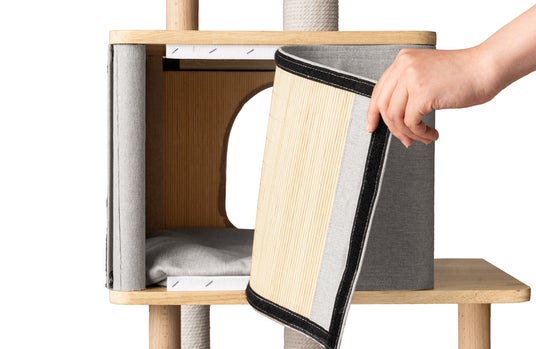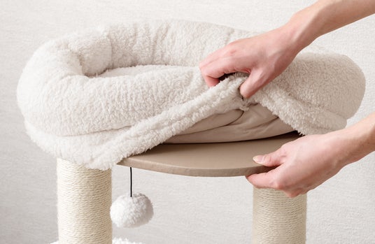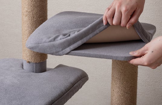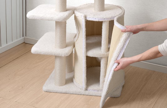 爪とぎは支柱だけでなく、ハウスの外壁部分でも行える多機能設計となっており、思う存分爪とぎをしてもらうことができます。最上段に設けたふっくらとしたベッドも取り外して丸洗いが可能なため、衛生面を気にせず長くご愛用いただけます。