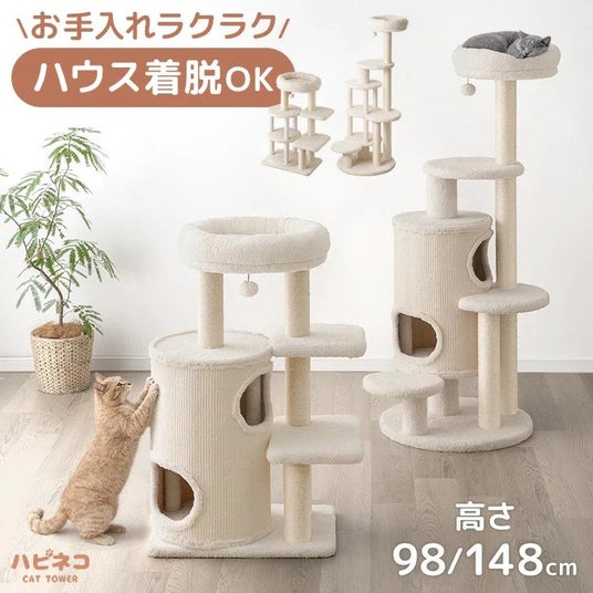 足腰の弱い子猫やシニア猫でも上り下りしやすい「高さ98cm」と、活発な猫が思いっきり遊べる「高さ148cm」の2タイプを展開。愛猫の成長段階や、お部屋のスペースに合わせて最適なモデルを選択可能です。