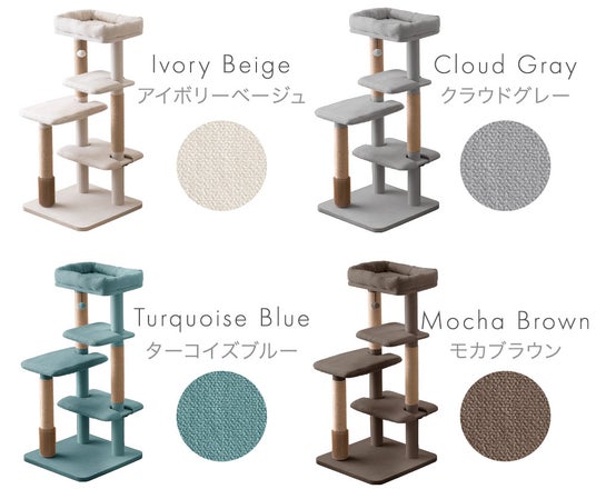 ステップからハウス、おもちゃのボールに至るまで、全てのパーツを『ミルクアイボリー』で統一した、もこもこデザインのキャットタワーです。ナチュラルなインテリアにも合わせやすいデザインになっています。