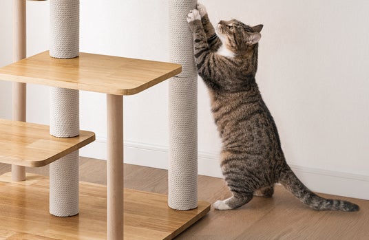 3本設置している爪とぎポールは、長めに設計することにより爪をより研ぎやすい仕様にしています。また爪とぎポールは全面、綿紐仕様にすることで研ぎカスが少なく、お掃除が楽なのはもちろん、よりお部屋に馴染みやすく、麻に比べてにおいが薄い点も魅力です。
