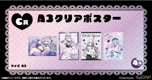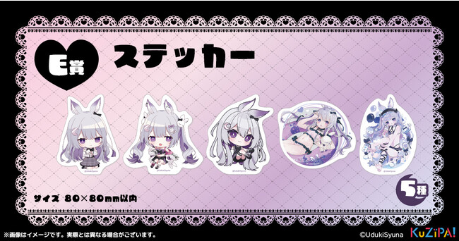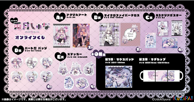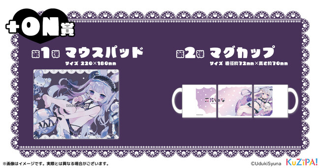 耐久配信を連続10時間もこなす配信モンスターである「兎月しゅな」さんの可愛らしいオリジナルグッズを5種類揃えています。くじを引くごとに自動抽選にて豪華景品ゲットのチャンスがある「+ON賞」では、海の中にぷかぷか浮かぶ姿が描かれたマウスパッドや薄紫色が目を惹くマグカップがそれぞれ10名の方に当たります。