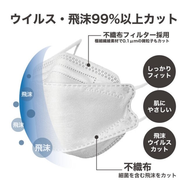 3D設計で口元に空間ができるので息がしやすく、ウイルスも飛沫も99%カットしてくれます!