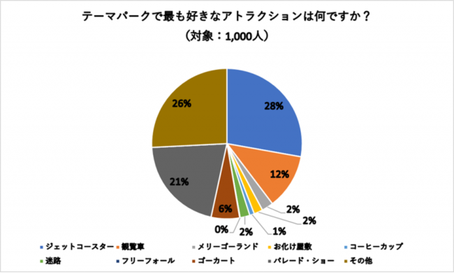 最も好きなアトラクションについては、ジェットコースターを選んだ人が28%、次いでメリーゴーランドを選んだ人が21%でした。また、26%もの人が「その他」と回答しており、好みが分かれる結果となっています。アトラクションは、テーマパーク特有のものが多いことも影響しているのではないでしょうか。