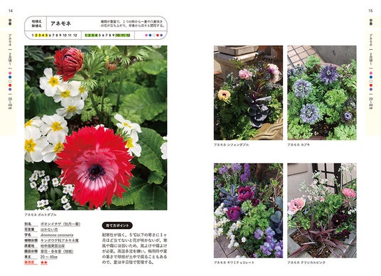 開花期、色、草丈がインデックスになっているので、組み合わせる花を選ぶのにも便利です! 写真の下には各花の品種名を明記。「アネモネ」一つとっても、たくさんの改良品種があることが分かります。