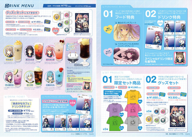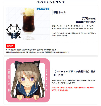 ヒロインたちをイメージした可愛いドリンクや、クイズに正解した方のみ注文可能なスペシャルドリンク「邪神ちゃん」など豪華なラインナップをご提供いたします。