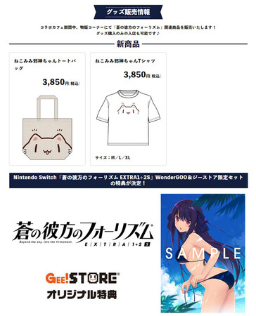 ジーストア&WonderGOOオリジナル特典【描き下ろしタペストリー】が付いた限定セットの『蒼の彼方のフォーリズム EXTRA1+2S』ソフトをはじめ、新商品の「ねこみみ邪神ちゃんTシャツ」「ねこみみ邪神ちゃんトートバッグ」もラインナップ。
