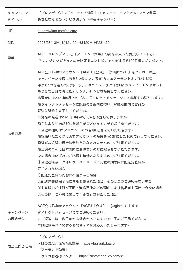 キャンペーン期間中、AGF(R)【公式】Twitterアカウント(@agfcm2)にて、飲んでみたいアレンジレシピを選んでツイートすると、「ブレンディ(R)」インスタントコーヒー、「アーモンド効果」のお試しセットと、アレンジレシピをまとめた限定ミニレシピブックが抽選で100名様に当たります。限定ミニレシピブックには、「ブレンディ(R)」と「アーモンド効果」の両ブランドをいずれも愛するファンの方々とのファンミーティングで考案したオリジナルレシピの“カフェアーモンドオレ”を掲載し、本レシピはAGF(R)Loungeサイトでもキャンペーン開始と同時に公開いたします。