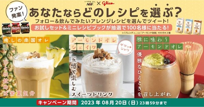 江崎グリコ株式会社は、味の素AGF株式会社(本社:東京都渋谷区、代表取締役社長:竹内 秀樹、以下:AGF)が展開するブランド「ブレンディ(R)」と協業し、<「ブレンディ(R)」×「アーモンド効果」の“カフェアーモンドオレ”ファン発案!あなたならどのレシピを選ぶ?Twitterキャンペーン>を2023年8月3日(木)~8月20日(日)まで実施します。