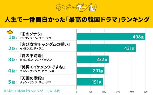 ランキングー!では最高の韓国ドラマをピックアップし、ランキングを調査。全年代の女性6,334名にアンケートを行い、TOP10を決定しました。ここではTOP5をご紹介します。