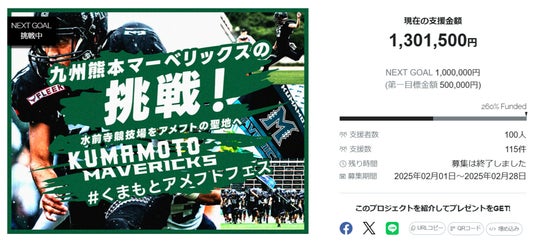 チーム・団体やアスリートを支援するスポーツ専門クラウドファンディングを展開するスポチュニティ株式会社(東京都中央区、以下スポチュニティ)は、九州社会人アメリカンフットボール連盟所属の九州熊本マーベリックスのクラウドファンディングを実施し、支援金額が1st・2nd Goalを達成し、最終的に1,301,500円に達し終了しました。