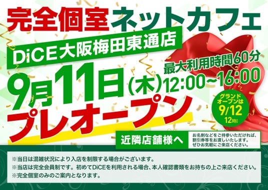 当社のグループ会社、株式会社ディスクシティエンタテインメント(本社:神奈川県横浜市、代表取締役:三田 大明)が運営するインターネットカフェDiCEは、2025年9月12日12時に大阪二号店となる「DiCE大阪梅田東通店」を開業いたします。