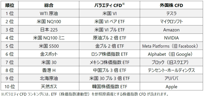 ~総合首位はWTI原油!バラエティCFDでは米国VI、外国株CFDではテスラが首位に~