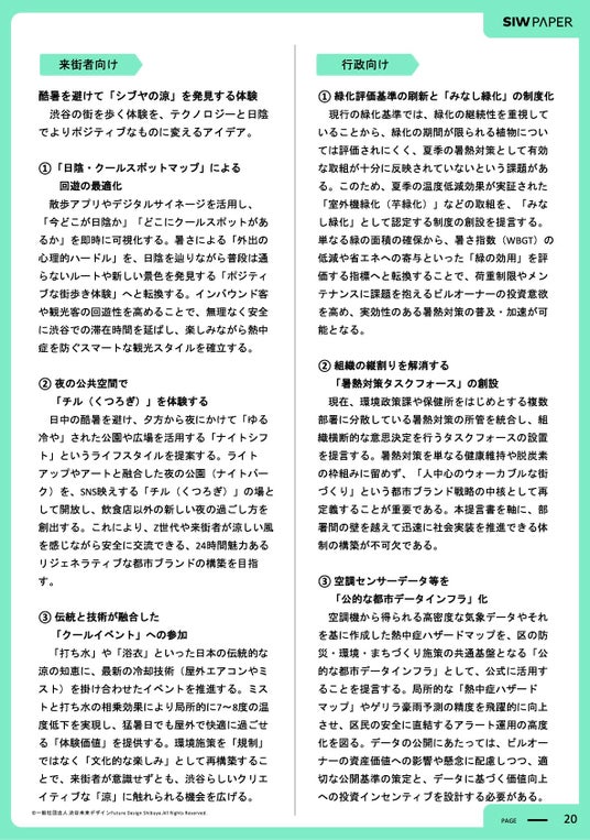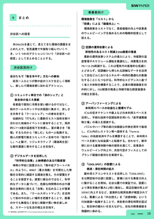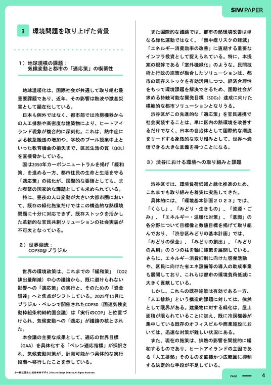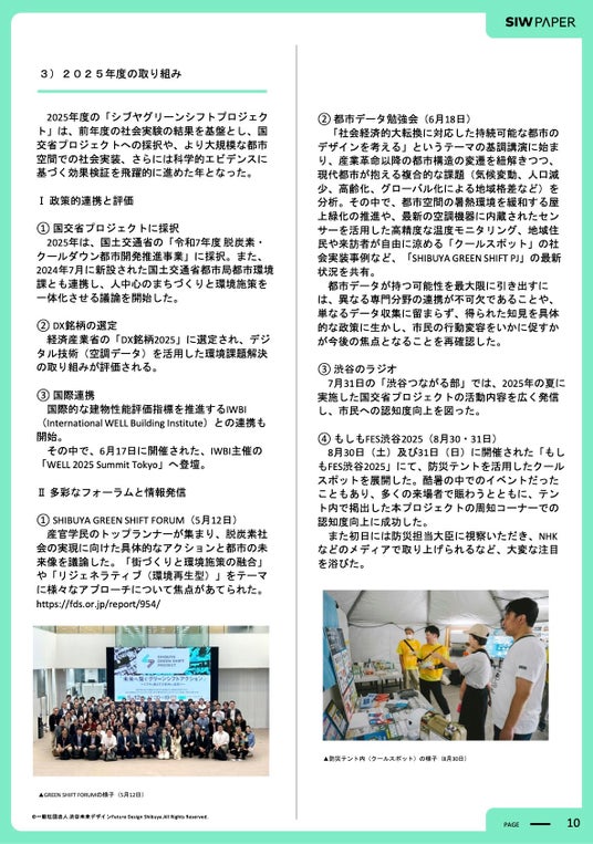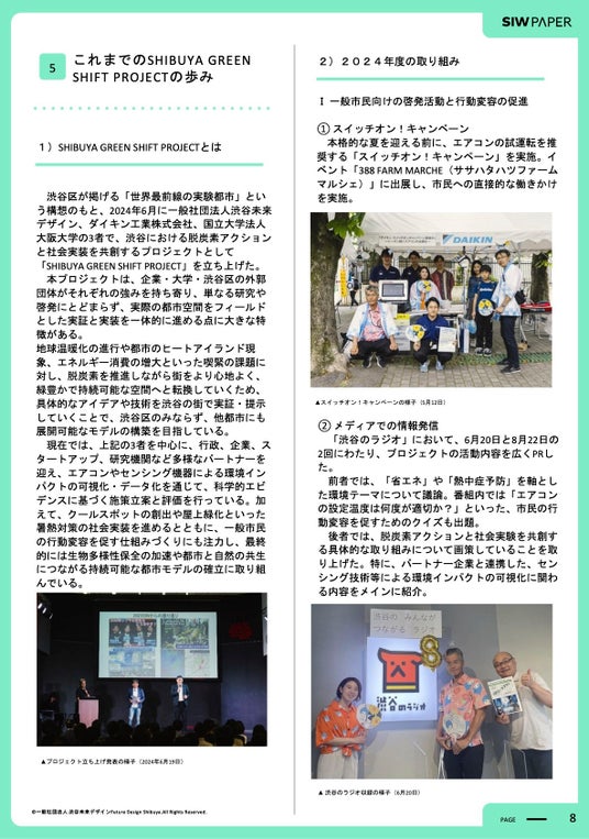 その内容を取りまとめたSIW PAPERではSHIBUYA GREEN SHIFT PROJECT立ち上げから2年間の活動実績や、ダイキン工業による暑熱対策に関する効果検証結果、議論の中で気づきがあった“環境の現状や未来”、渋谷区のような大都市における環境問題について行政・企業・区民が連携し、環境施策の強い都市に向かうためのアイデアや具体的な提言を掲載しています。