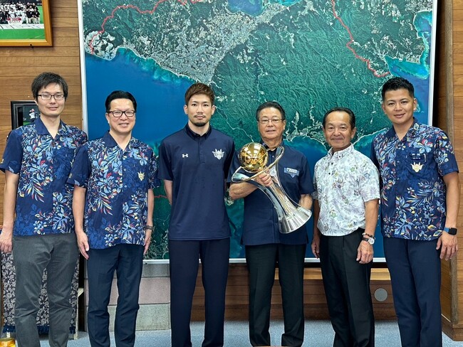 「名護(75)の日」である7月5日(水)に、渡具知武豊 名護市長へBリーグ初優勝のご報告を兼ねた表敬訪問を行いました。琉球ゴールデンキングスから名護市出身の#14 岸本隆一選手が参加し、表敬訪問では渡具知 名護市長をはじめ、優勝記念Tシャツを着用した市職員の方々にお出迎えいただき、多くのお祝いのお言葉をいただきました。