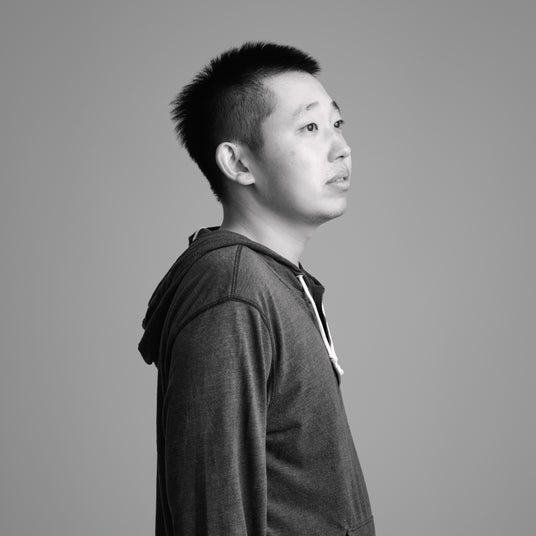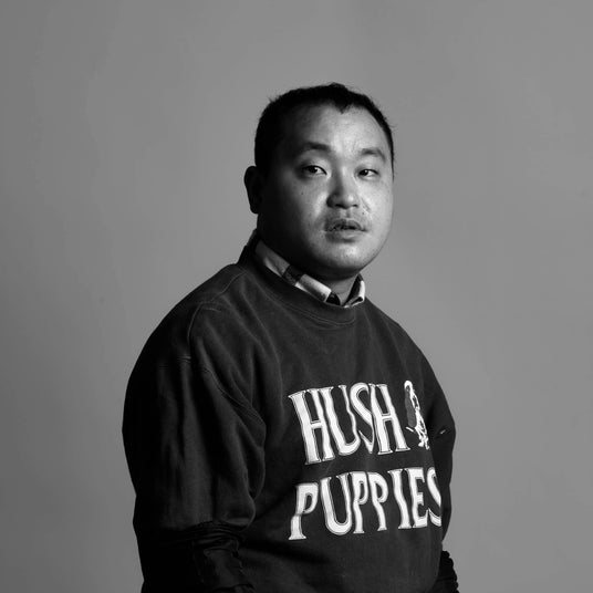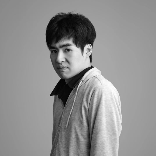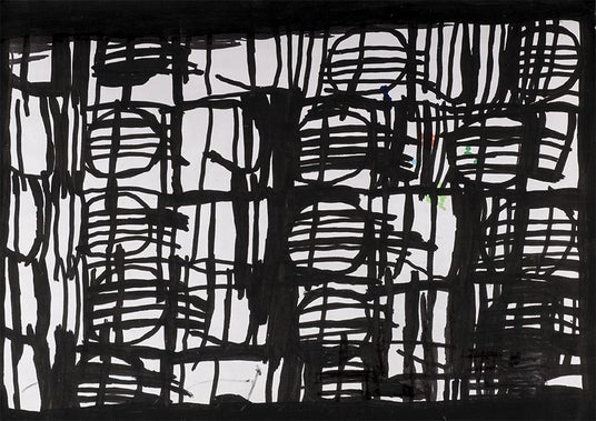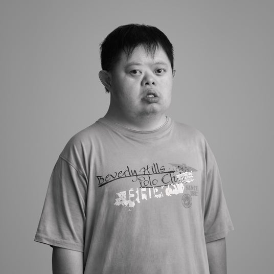 1998年生まれ 滋賀県在住 2017年から『やまなみ工房』に在籍 元々は紙を切って大好きな扇風機のプロペラ作っては眺めることが好きだった彼だが、職員の書く字を真似たり、窓に指で文字をなぞられたりする様子から、英字新聞をお渡しすると画用紙に模写されたことが絵画に取り組まれるきっかけとなった。英字の他数字の作品も多く、描かれるときは、一切の迷いや躊躇は無く、あっという間に描き終えられ、勢いや力強さが英字や数字の書体にも表れている。文字は色を変えて筆やペン、時には指を用いて何度も上からなぞられることが多く、より作品に深みをもたらしている。最近は文字だけでなく、人物や自分の好きなものを絵にされる作品も生まれ、クールな作風と合わせて彼独特の感性が作品にも反映されている。