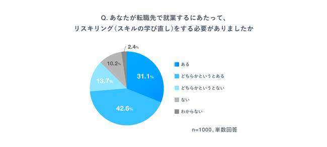 転職先で就業するにあたり、リスキリング(スキルの学び直し)をする必要があったかを聞いたところ、「ある」が31.1%、「どちらかというとある」が42.6%となり、合計で7割以上(73.7%)が転職時にリスキリングの必要に迫られていたことが判明しました。