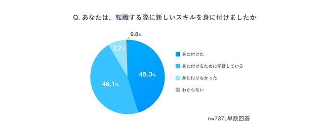 リスキリングが必要と答えた回答者に対し、実際に新しいスキルを身に付けたかを聞くと、「身に付けた」が45.3%、「身に付けるために学習している」が46.1%と回答し、9割を超える回答者(91.4%)がスキルの習得に取り組んでいることが分かりました。転職のためのリスキリングが浸透していることがうかがえる結果となりました。