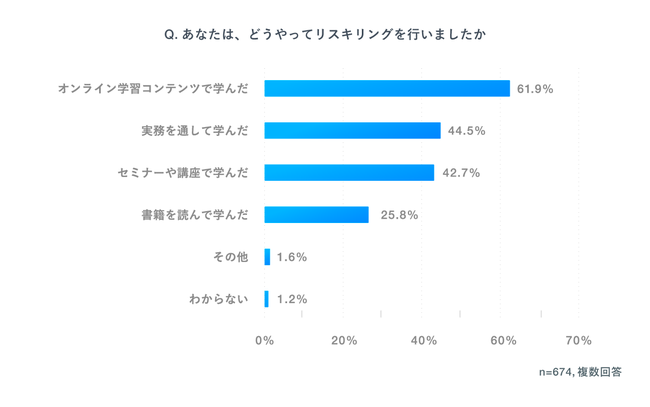 また、新しいスキルを「身に付けた」、「身に付けるために学習している」と回答した人にどのような方法でリスキリングを行ったのかを聞いたところ、「オンライン学習コンテンツ」が最も多く6割以上(61.9%)にも上りました。多忙なビジネスパーソンにとってオンライン学習コンテンツはスキマ時間を有効活用できることから人気が集まっていると考えられます。