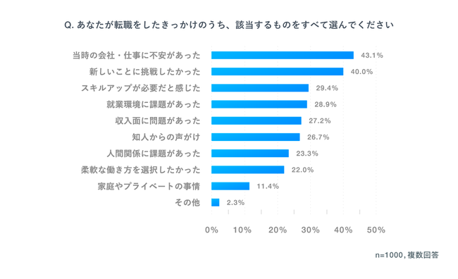 転職のきっかけとしては「当時の会社・仕事に不安があった(43.1%)」が最も多かったものの、次いで「新しいことに挑戦したかった(40.0%)」や「スキルアップが必要だと感じた(29.4%)」など、自らのキャリア形成に対して積極的な姿勢が読み取れる選択肢に回答が集まりました。転職時にリスキリングをしたと回答した人が多かったこともうなずける結果となっています。