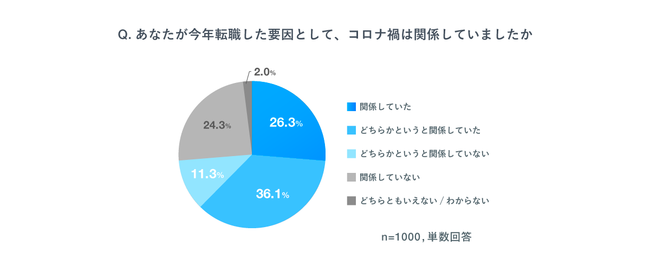 2022年に転職した要因としてコロナ禍が関係していたかを聞いたところ、「関係していた(26.3%)」「どちらかというと関係していた(36.1%)」の合計が62.4%となり、引き続きコロナ禍による影響が見受けられました。