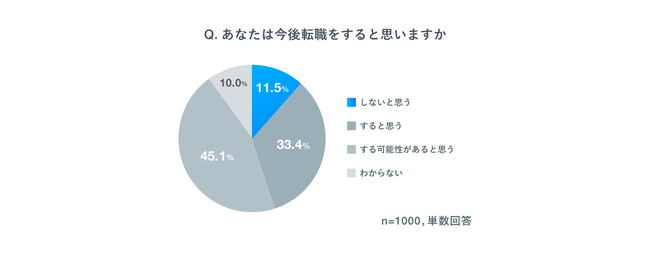 次に、転職という選択のハードルを明らかにするべく、今後転職をすると思うかと聞いたところ、「しないと思う」と回答したのは11.5%でわずか1割であることが判明しました。