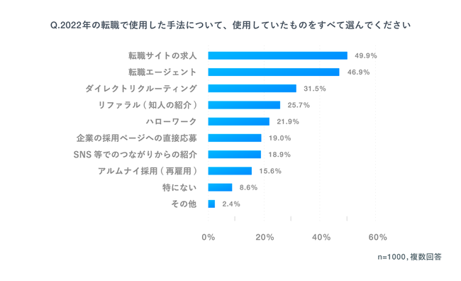 最後に、転職時に利用したサービスを聞いたところ、従来型の「転職サイトの求人(49.9%)」「転職エージェント(46.9%)」についで、「ダイレクトリクルーティング(31.5%)」に回答が集まりました。およそ3人に1人はダイレクトリクルーティングを活用しており、転職の手法として浸透している様子がうかがえます。