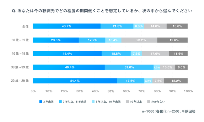 今後転職を想定していないのはわずか1割、3人に2人は新しい職場での勤務を5年未満と考えている