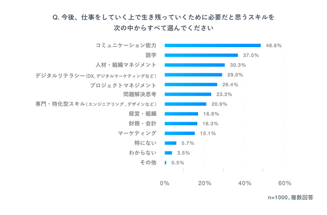 続いて、実際にどのようなスキルがビジネスにおいて重要視されているのかを明らかにするため、今後仕事をする上で生き残っていくために必要だと思うスキルを聞いたところ、「コミュニケーション能力(48.6%)」「語学(37.0%)」「人材・組織マネジメント(30.3%)」がトップ3となりました。次いで「デジタルリテラシー(29.0%)」と「プロジェクトマネジメント(26.4%)」に回答が集まり、上位にランクインする結果となっています。