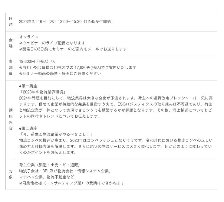 「今後、物流業界ではどのような変化が起きるか知りたい」「今後の運賃値上げは、いつ、どの程度の値上げ率でくるのか見込みを立てたい」「2023年に取り組むべきことを整理したい」そのような荷主企業様(製造・小売・卸・通販)や、物流子会社、3PL及び物流会社、情報システム企業、マテハン企業、物流不動産様などにぜひご参加いただきたいセミナーです。