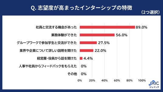 インターンシップを通じて「志望度が高まった」と回答した学生に、「志望度が高まったインターシップの特徴として、あてはまるものをふたつ選択してください」と質問したところ、「社員と交流する機会があった」が89.0%、「業務体験ができた」が56.0%、「グループワークで参加学生と交流ができた」が27.5%、「業界や企業について詳しい説明を聞けた」が22.0%、「経営層・役員から話を聞けた」が4.4%、「人事や社員からフィードバックをもらえた」「その他」がそれぞれ0%となりました。