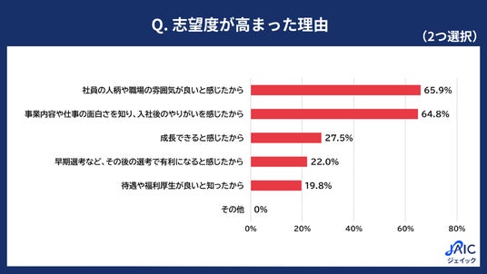 インターンシップを通じて「志望度が高まった」と回答した学生に、「志望度が高まった理由として、あてはまるものをふたつ選択してください」と質問したところ、「社員の人柄や職場の雰囲気が良いと感じたから」が65.9%、「事業内容や仕事の面白さを知り、入社後のやりがいを感じたから」が64.8%、「成長できると感じたから」が27.5%、「早期選考など、その後の選考で有利になると感じたから」が22.0%、「待遇や福利厚生が良いと知ったから」が19.8%となりました。