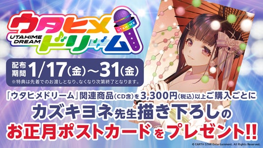 ウタヒメドリーム関連商品(CD含)を税込¥3,300以上購入毎に、カズキヨネ先生描き下ろしのお正月ポストカードをプレゼントいたします。