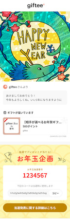 2024年の幕開けを祝したお年玉キャンペーンを「giftee(R)」で開催します。2023年12月27日(水)~2024年1月10日(水)の期間中に発行されたeギフトを受け取られた方が対象となるキャンペーンです。ギフトカード画面下部に表示される「お年玉抽選番号」から参加可能です。当選発表は2024年1月15日(月)10:00から実施され、当選者には「giftee Box for 新年」を合計50名様にプレゼントいたします。なお、期間中は「ギフトを贈る」ボタンから発行された全てのeギフトに「お年玉抽選番号」が付与されます。(特集ページURL:https://giftee.com/announcements/355 )