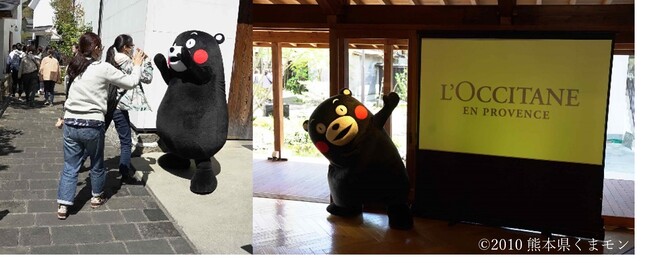 植樹イベント後には通潤橋の放水をバスから見学した後、地元山都町で自然に寄り添う伝統的な手法で酒造りをおこなう通潤酒造のカフェ施設に移動し、ランチイベントがスタート。到着した参加者をくまモンが出迎え、写真撮影に応じるなど植樹参加で疲労した参加者たちの心と体を癒す一役も。ランチイベントの中ではロクシタンのこれまでのCSR活動の取り組みを紹介しながら地元の食材が入ったおいしいランチをいただきました。