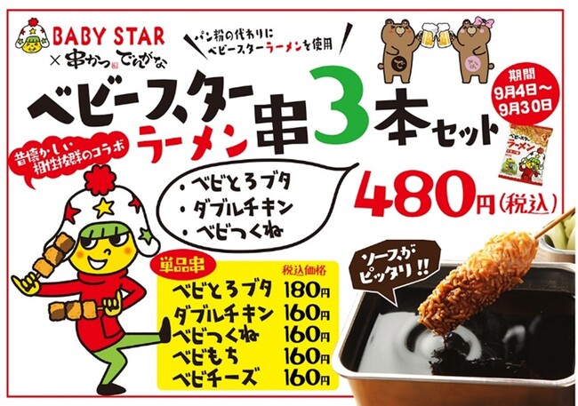 2017年、『串かつ でんがな』の一部店舗での試験販売からスタートし、2018年に約1ヶ月間の期間限定で『串かつ でんがな』全店舗でのメニュー展開となったベビースター衣のコラボ串。そして、この度、9月4日『串(くし)の日』に期間限定で復刻します!双方の商品を通じて、新規顧客層の獲得、認知促進の相乗効果を目指します。