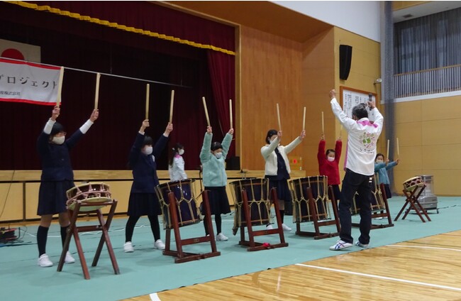 子どもたちは、演奏に合わせて自由にリズムに乗ってダンスをしたり、三味線の授業を受けている高学年の児童は特に三味線の演奏に聞き入ったりしていました。また、和太鼓の演奏体験では中学生が力強く迫力のある音を響かせ、小学生を驚かせていました。