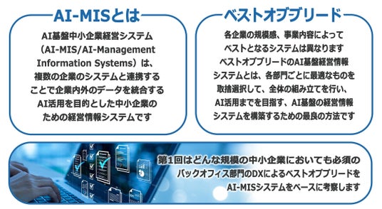 AI-MIS(TM)︎(経営情報システム)とは、AI基盤のデータ統合システムです。企業内に分散しているファイルを収集し、分析、予測、レポーティングなどを通じて、AIによるデータ主導の経営を支援するシステムです。ベストオブブリードとは、異なる企業が製造したシステムやアプリを組み合わせて、業務効率やパフォーマンスを最適化する戦略となります。本フォーラムでは、このノウハウを経営者様にお伝えすることを目的として、開催いたします。