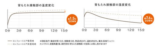 *コンフォートエア有無による背もたれ接触部の温度及び湿度計測結果