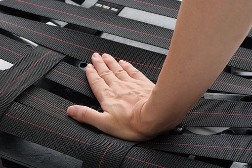 ウェビングをシートの土台に組み込み、身体を面でやさしく支える構造を採用。
