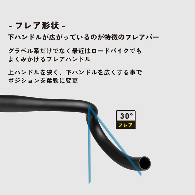 グラベル系だけでなく最近はロードバイクでもよくみかけるフレアハンドルは上ハンドルを狭く、