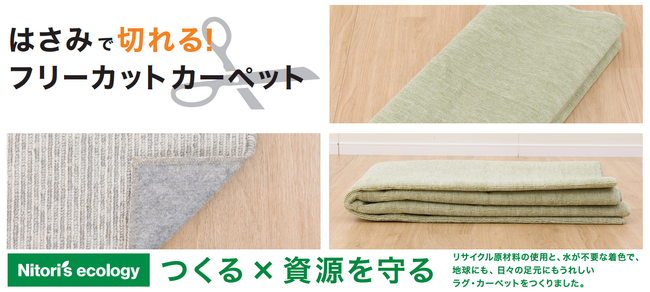 はさみでカットしやすく端からほつれにくいため、お部屋の柱部分などの形に合わせて敷き込むことができます。処分する時に小さくカットすれば、かさばらず便利。また、リサイクル原材料を水を使わずに着色した繊維を一部使用しており、地球にやさしい商品です。