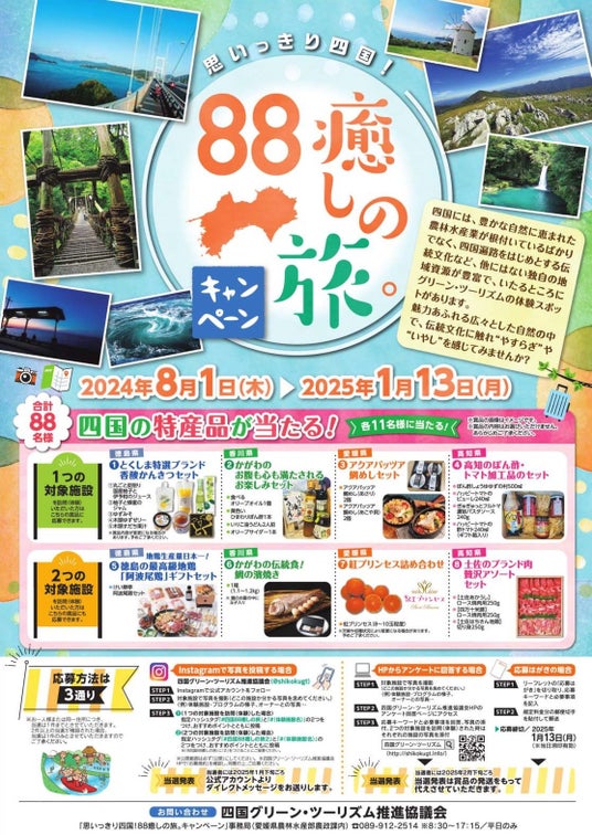 今年も、四国のグリーン・ツーリズム関連施設88施設を訪問し、キャンペーンに御応募いただいた方の中から抽選で88名様に、四国の特産品が当たる「思いっきり四国!88癒しの旅。キャンペーン」を開催します。