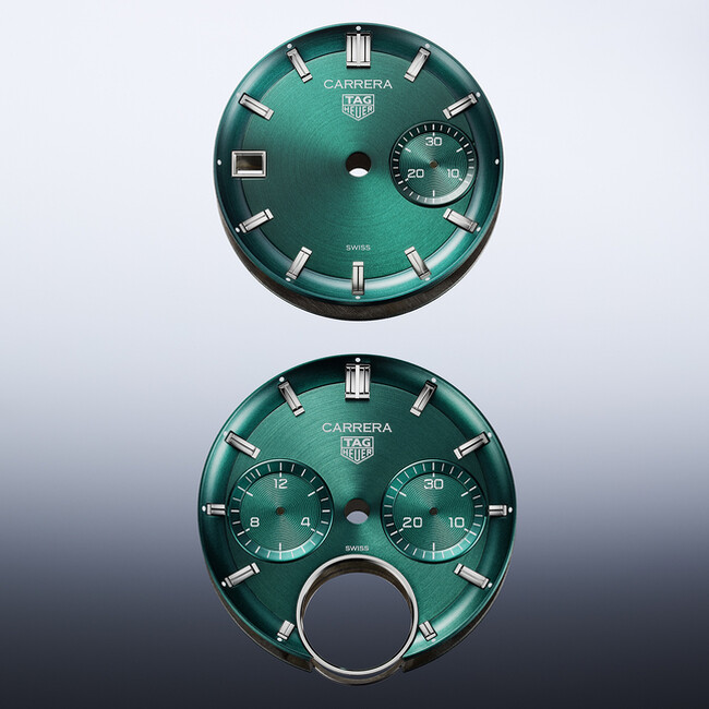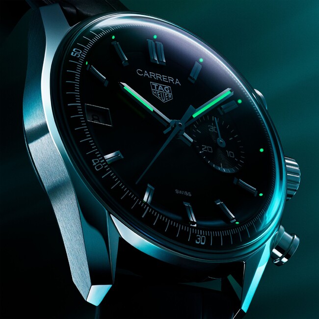 今回の新作の中でも屈指の注目の的は、ティールグリーンをカレラコレクションのテーマカラーとして採用したことです。この独特の色調は、2021年のタグ・ホイヤー カレラ限定モデルで初めて登場し、2023年にはタグ・ホイヤー カレラ クロノグラフの通常モデルにも採用されました。そして2024年、カレラ DATOに着想を得たグラスボックスのクロノグラフとトゥールビヨンモデルで、力強い復活を遂げたのです。