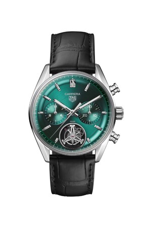 今回の発表を締めくくるのは、コレクションに加わった魅惑的な仲間、タグ・ホイヤー カレラ トゥールビヨン クロノグラフです。優美なティールグリーンにサーキュラーサテン仕上げを施したダイヤルの洗練された雰囲気を醸すステートメントピースです。